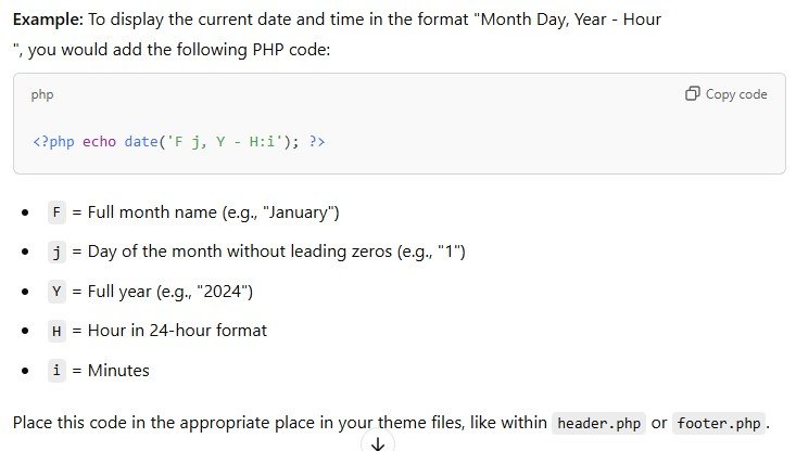 For those comfortable with editing theme files, you can add PHP code directly to your WordPress theme to show the WordPress present date and time. This method requires editing your theme’s header.php, footer.php, or any other template file where you want the date and time to appear.